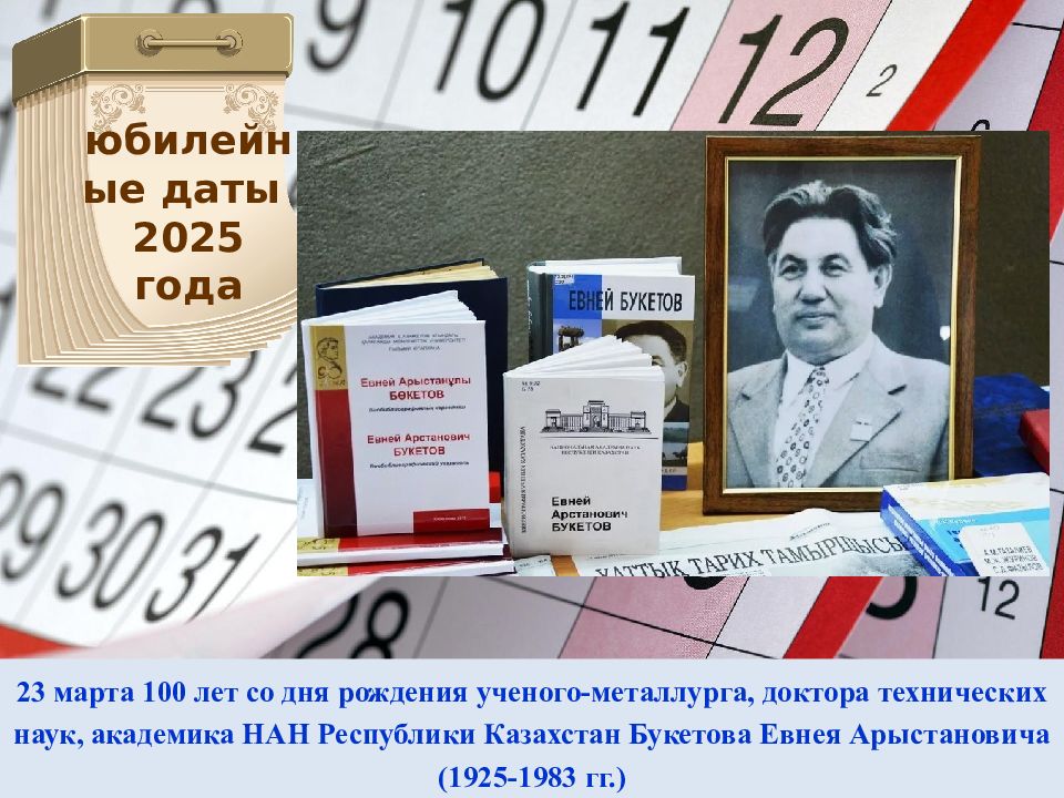 23 марта 100 лет со дня рождения ученого-металлурга, доктора технических наук, академика НАН Республики Казахстан Букетова Евнея Арыстановича (1925-1983 гг.) юбилейные даты 2025 года