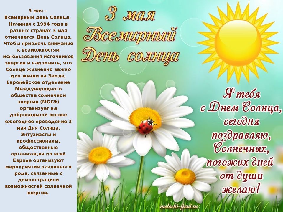 3 мая – Всемирный день Солнца. Начиная с 1994 года в разных странах 3 мая отмечается День Солнца. Чтобы привлечь внимание к возможностям использования источников энергии и напомнить, что Солнце жизненно важно для жизни на Земле, Европейское отделение Международного общества солнечной энергии (МОСЭ) организует на добровольной основе ежегодное проведение 3 мая Дня Солнца. Энтузиасты и профессионалы, общественные организации по всей Европе организуют мероприятия различного рода, связанные с демонстрацией возможностей солнечной энергии.