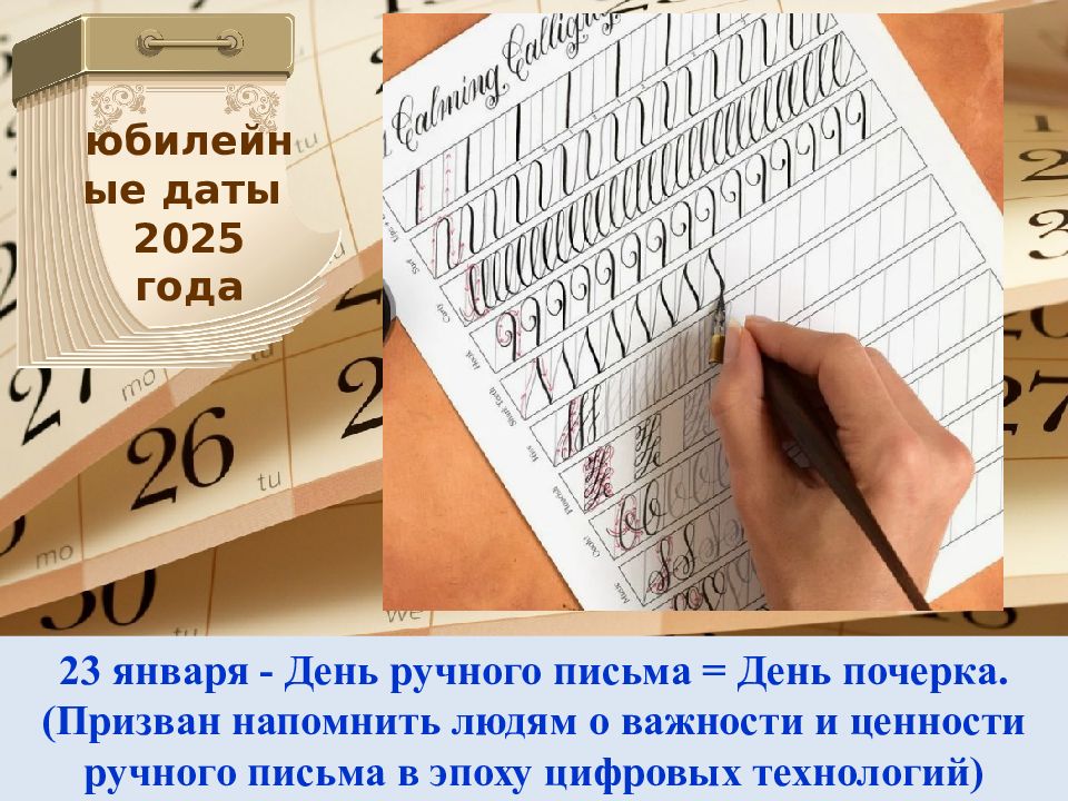 23 января - День ручного письма = День почерка. (Призван напомнить людям о важности и ценности ручного письма в эпоху цифровых технологий) юбилейные даты 2025 года