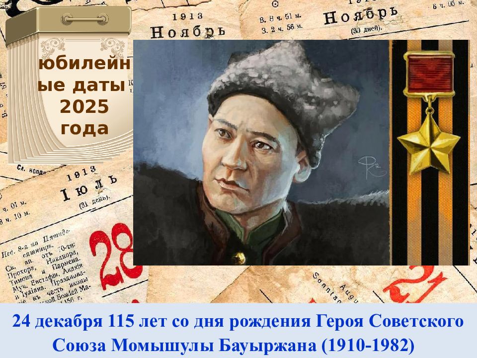 24 декабря 115 лет со дня рождения Героя Советского Союза Момышулы Бауыржана (1910-1982) юбилейные даты 2025 года