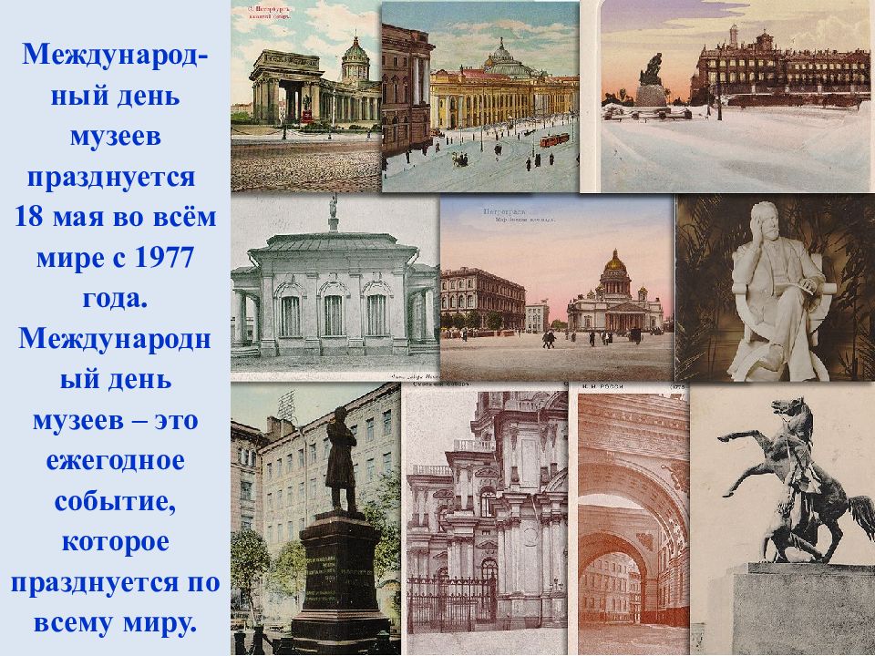 Международ-ный день музеев празднуется 18 мая во всём мире с 1977 года. Международный день музеев – это ежегодное событие, которое празднуется по всему миру.