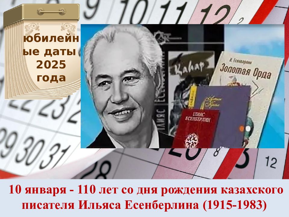 10 января - 110 лет со дня рождения казахского писателя Ильяса Есенберлина ( 1915-1983) юбилейные даты 2025 года