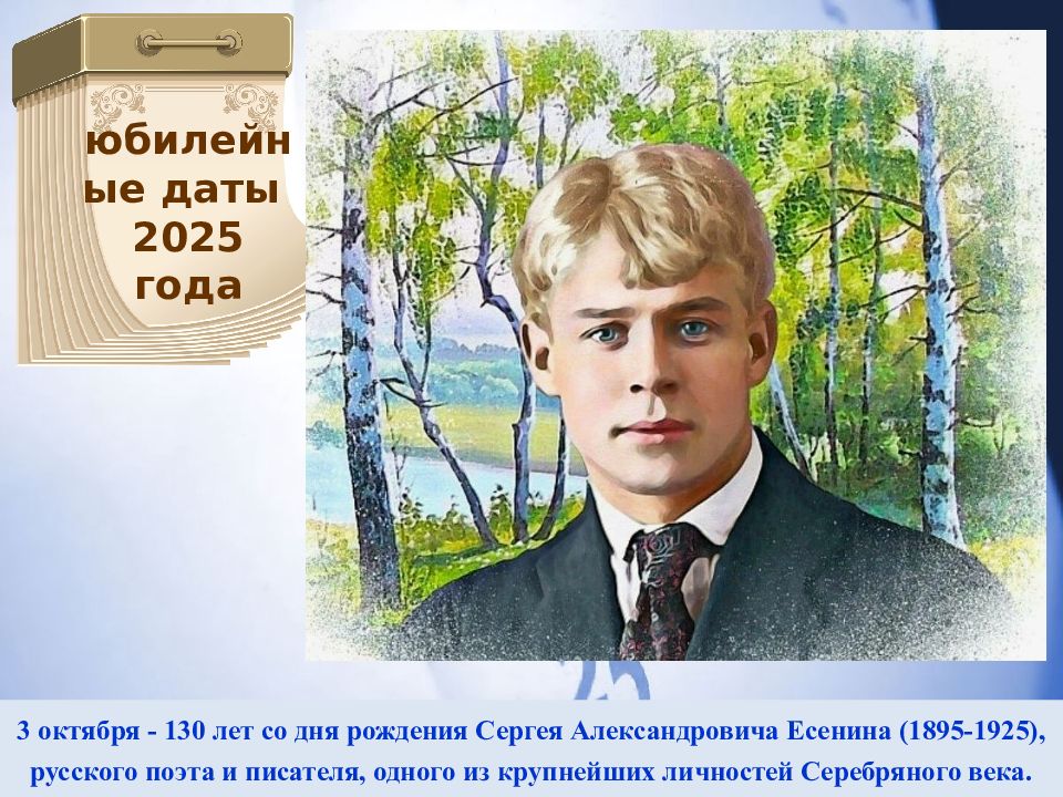 3 октября - 130 лет со дня рождения Сергея Александровича Есенина (1895-1925), русского поэта и писателя, одного из крупнейших личностей Серебряного века. юбилейные даты 2025 года