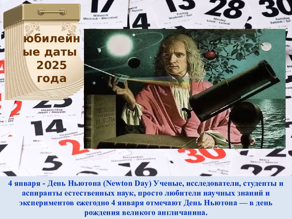 4 января - День Ньютона ( Newton Day ) Ученые, исследователи, студенты и аспиранты естественных наук, просто любители научных знаний и экспериментов ежегодно 4 января отмечают День Ньютона — в день рождения великого англичанина. юбилейные даты 2025 года