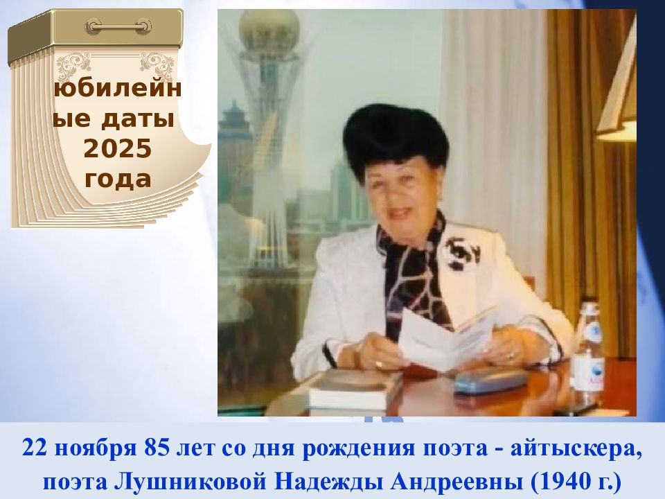 22 ноября 85 лет со дня рождения поэта - айтыскера, поэта Лушниковой Надежды Андреевны (1940 г.) юбилейные даты 2025 года
