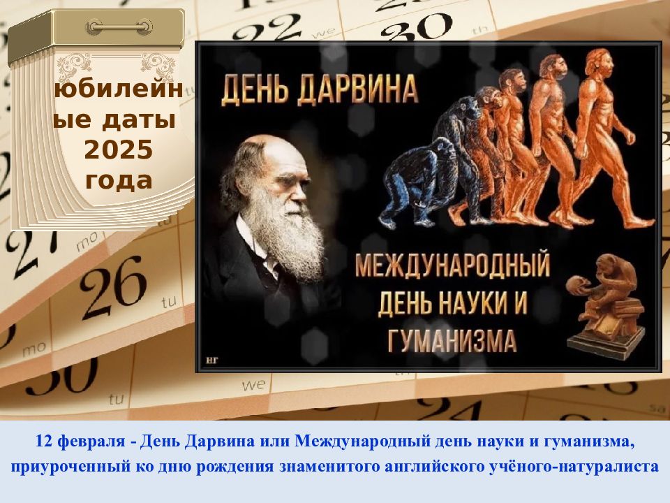 12 февраля - День Дарвина или Международный день науки и гуманизма, приуроченный ко дню рождения знаменитого английского учёного-натуралиста юбилейные даты 2025 года