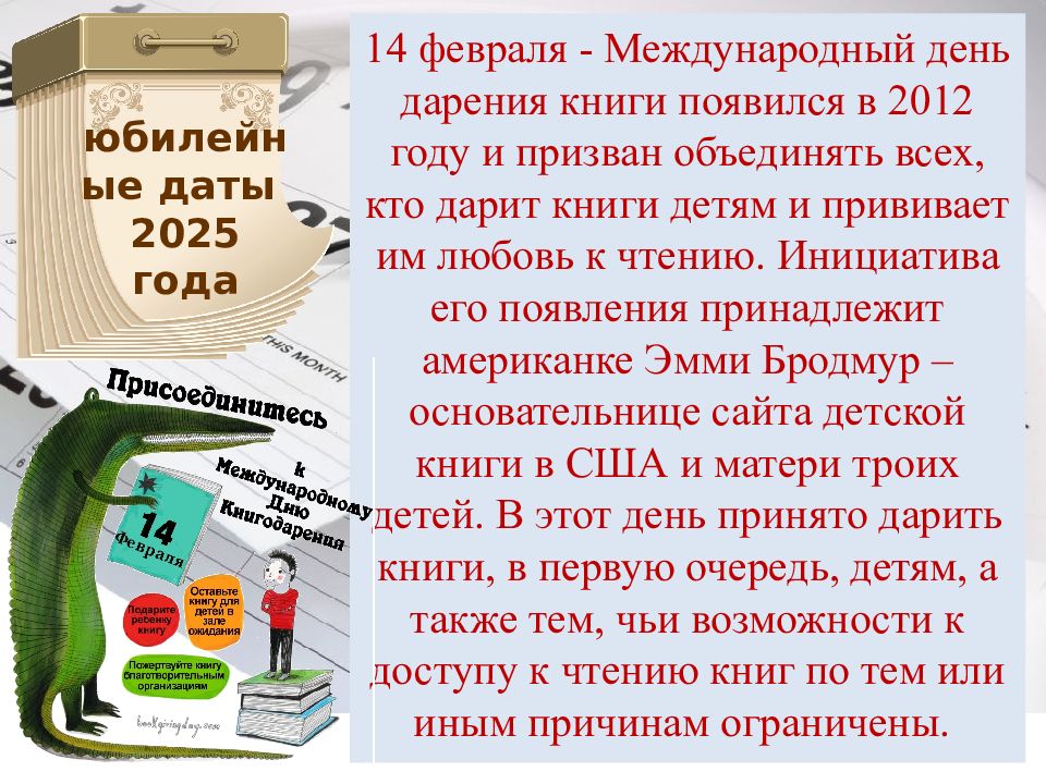 14 февраля - Международный день дарения книги появился в 2012 году и призван объединять всех, кто дарит книги детям и прививает им любовь к чтению. Инициатива его появления принадлежит американке Эмми Бродмур – основательнице сайта детской книги в США и матери троих детей. В этот день принято дарить книги, в первую очередь, детям, а также тем, чьи возможности к доступу к чтению книг по тем или иным причинам ограничены. юбилейные даты 2025 года