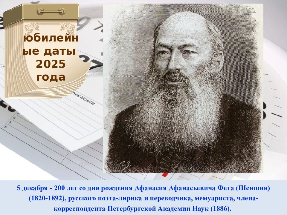 5 декабря - 200 лет со дня рождения Афанасия Афанасьевича Фета ( Шеншин ) (1820-1892 ), русского поэта-лирика и переводчика, мемуариста, члена-корреспондента Петербургской Академии Наук (1886). юбилейные даты 2025 года