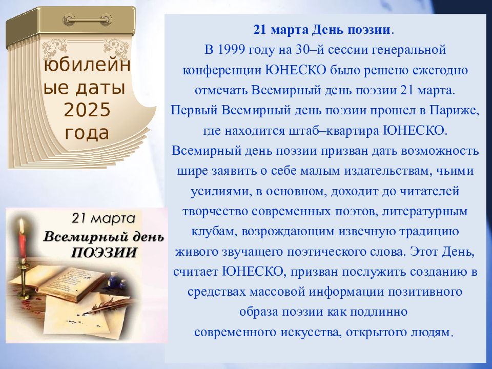 21 марта День поэзии. В 1999 году на 30– й сессии генеральной конференции ЮНЕСКО было решено ежегодно отмечать Всемирный день поэзии 21 марта. Первый Всемирный день поэзии прошел в Париже, где находится штаб–квартира ЮНЕСКО. Всемирный день поэзии призван дать возможность шире заявить о себе малым издательствам, чьими усилиями, в основном, доходит до читателей творчество современных поэтов, литературным клубам, возрождающим извечную традицию живого звучащего поэтического слова. Этот День, считает ЮНЕСКО, призван послужить созданию в средствах массовой информации позитивного образа поэзии как подлинно современного искусства, открытого людям. юбилейные даты 2025 года
