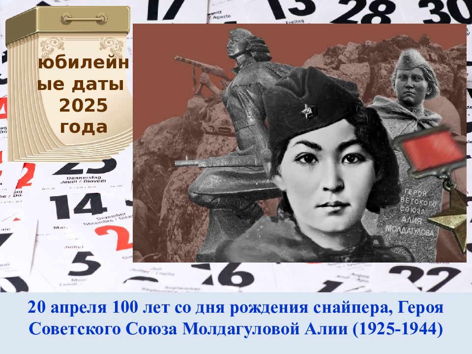 20 апреля 100 лет со дня рождения снайпера, Героя Советского Союза Молдагуловой Алии (1925-1944) юбилейные даты 2025 года