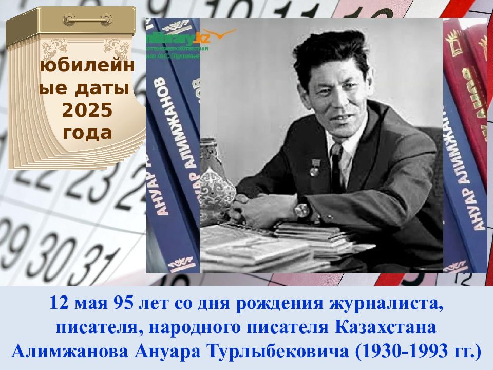12 мая 95 лет со дня рождения журналиста, писателя, народного писателя Казахстана Алимжанова Ануара Турлыбековича (1930-1993 гг.) юбилейные даты 2025 года