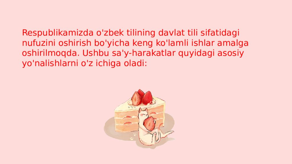Respublikamizda o'zbek tilining davlat tili sifatidagi nufuzini oshirish bo'yicha keng ko'lamli ishlar amalga oshirilmoqda. Ushbu sa'y-harakatlar quyidagi asosiy yo'nalishlarni o'z ichiga oladi: