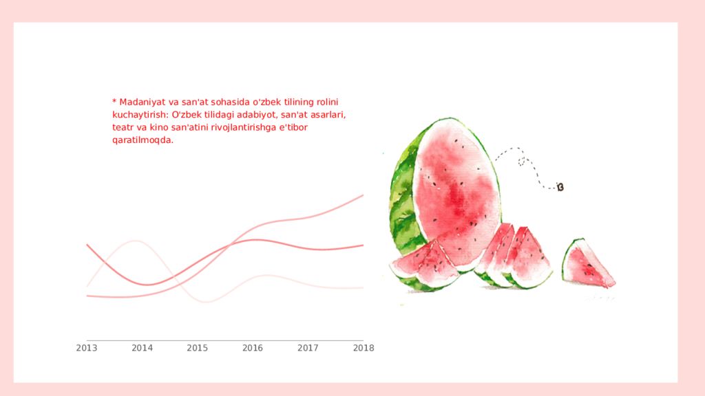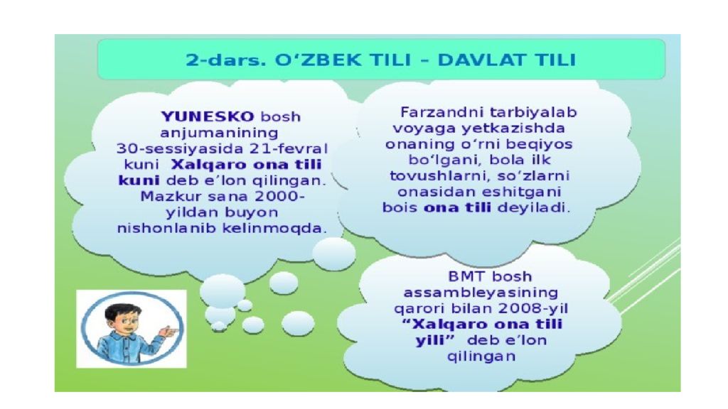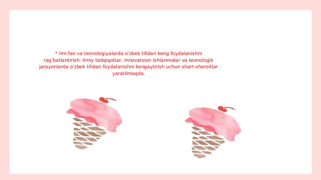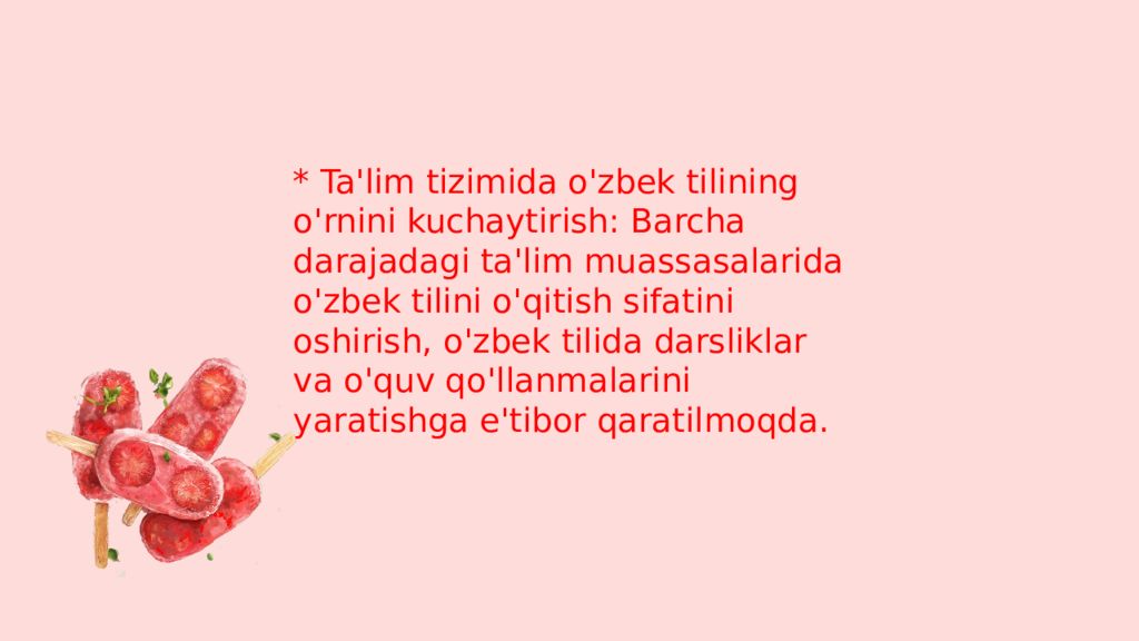 * Ilm-fan va texnologiyalarda o'zbek tilidan keng foydalanishni rag'batlantirish: Ilmiy tadqiqotlar, innovatsion ishlanmalar va texnologik jarayonlarda o'zbek tilidan foydalanishni kengaytirish uchun shart-sharoitlar yaratilmoqda.
