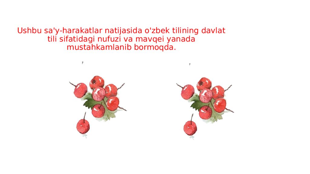 Ushbu sa'y-harakatlar natijasida o'zbek tilining davlat tili sifatidagi nufuzi va mavqei yanada mustahkamlanib bormoqda.