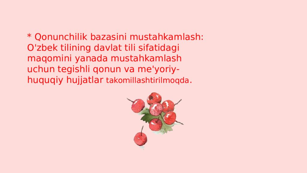 * Qonunchilik bazasini mustahkamlash: O'zbek tilining davlat tili sifatidagi maqomini yanada mustahkamlash uchun tegishli qonun va me'yoriy-huquqiy hujjatlar takomillashtirilmoqda.