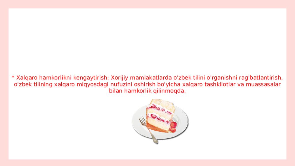 * Xalqaro hamkorlikni kengaytirish: Xorijiy mamlakatlarda o'zbek tilini o'rganishni rag'batlantirish, o'zbek tilining xalqaro miqyosdagi nufuzini oshirish bo'yicha xalqaro tashkilotlar va muassasalar bilan hamkorlik qilinmoqda.