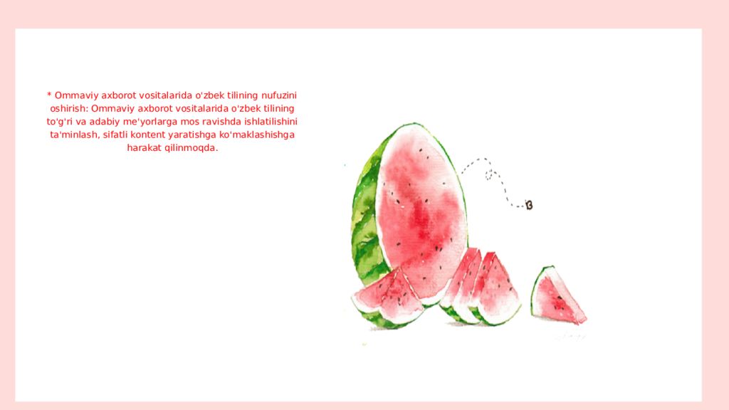 * Ommaviy axborot vositalarida o'zbek tilining nufuzini oshirish: Ommaviy axborot vositalarida o'zbek tilining to'g'ri va adabiy me'yorlarga mos ravishda ishlatilishini ta'minlash, sifatli kontent yaratishga ko'maklashishga harakat qilinmoqda.