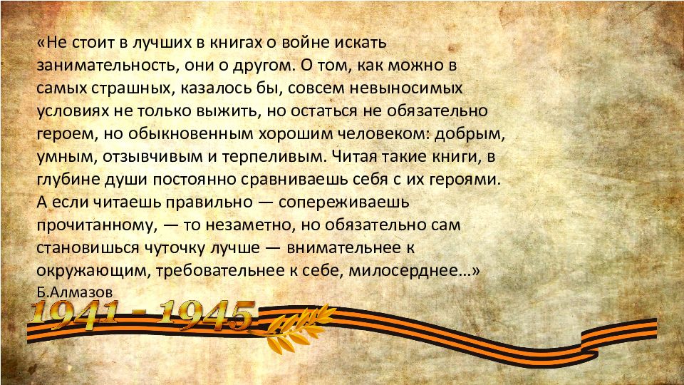 «Не стоит в лучших в книгах о войне искать занимательность, они о другом. О том, как можно в самых страшных, казалось бы, совсем невыносимых условиях не только выжить, но остаться не обязательно героем, но обыкновенным хорошим человеком: добрым, умным, отзывчивым и терпеливым. Читая такие книги, в глубине души постоянно сравниваешь себя с их героями. А если читаешь правильно — сопереживаешь прочитанному, — то незаметно, но обязательно сам становишься чуточку лучше — внимательнее к окружающим, требовательнее к себе, милосерднее …» Б.Алмазов