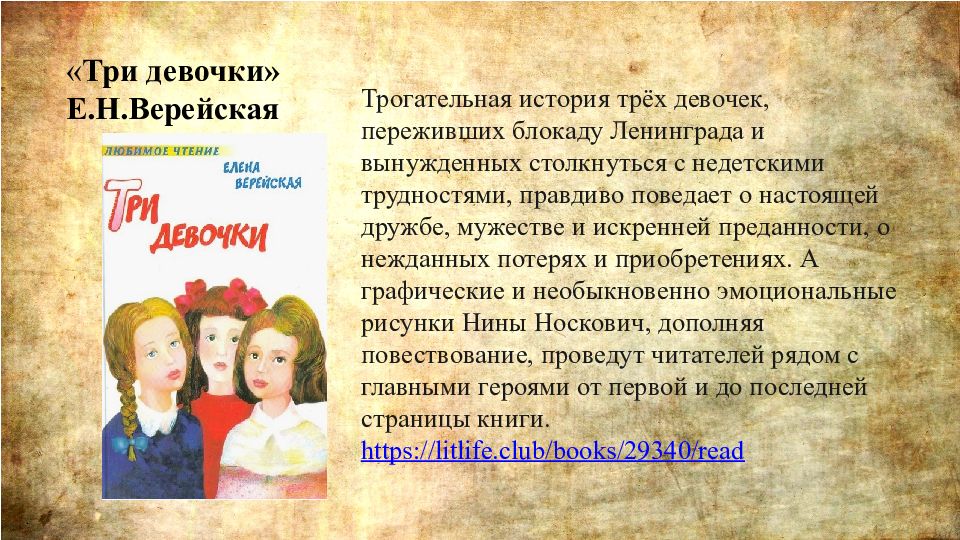 « Три девочки» Е.Н.Верейская Трогательная история трёх девочек, переживших блокаду Ленинграда и вынужденных столкнуться с недетскими трудностями, правдиво поведает о настоящей дружбе, мужестве и искренней преданности, о нежданных потерях и приобретениях. А графические и необыкновенно эмоциональные рисунки Нины Носкович, дополняя повествование, проведут читателей рядом с главными героями от первой и до последней страницы книги. https:// litlife.club/books/29340/read