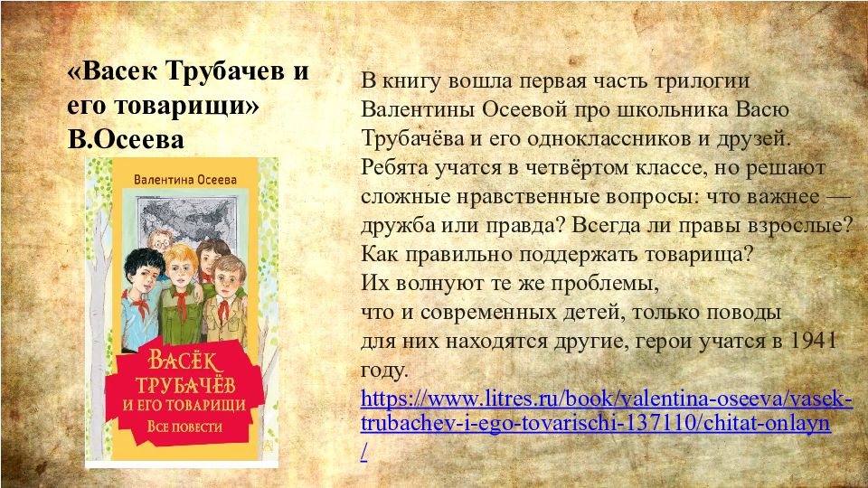 «Васек Трубачев и его товарищи» В.Осеева В книгу вошла первая часть трилогии Валентины Осеевой про школьника Васю Трубачёва и его одноклассников и друзей. Ребята учатся в четвёртом классе, но решают сложные нравственные вопросы: что важнее — дружба или правда? Всегда ли правы взрослые? Как правильно поддержать товарища? Их волнуют те же проблемы, что и современных детей, только поводы для них находятся другие, герои учатся в 1941 году. https://www.litres.ru/book/valentina-oseeva/vasek-trubachev-i-ego-tovarischi-137110/chitat-onlayn /