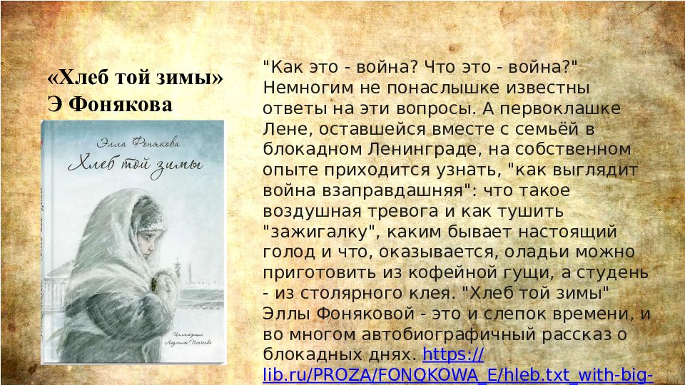 «Хлеб той зимы» Э Фонякова "Как это - война? Что это - война?" Немногим не понаслышке известны ответы на эти вопросы. А первоклашке Лене, оставшейся вместе с семьёй в блокадном Ленинграде, на собственном опыте приходится узнать, "как выглядит война взаправдашняя": что такое воздушная тревога и как тушить "зажигалку", каким бывает настоящий голод и что, оказывается, оладьи можно приготовить из кофейной гущи, а студень - из столярного клея. "Хлеб той зимы" Эллы Фоняковой - это и слепок времени, и во многом автобиографичный рассказ о блокадных днях. https:// lib.ru/PROZA/FONQKOWA_E/hleb.txt_with-big-pictures.html