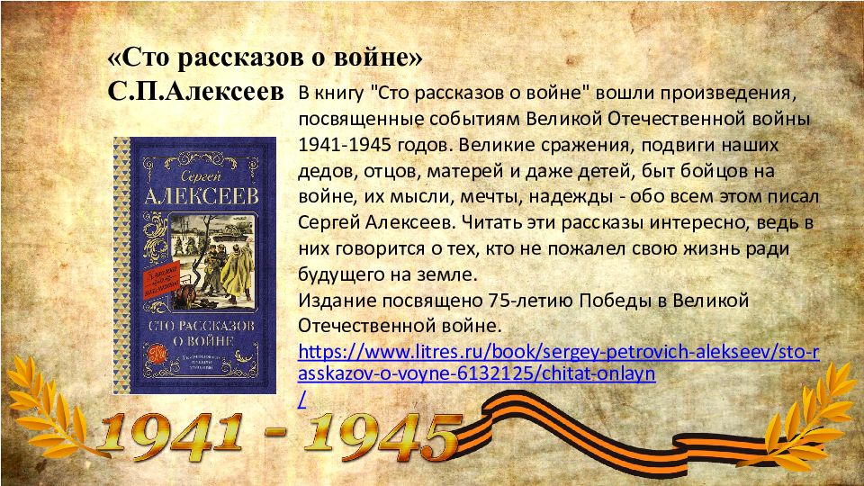 «Сто рассказов о войне» С.П.Алексеев В книгу "Сто рассказов о войне" вошли произведения, посвященные событиям Великой Отечественной войны 1941-1945 годов. Великие сражения, подвиги наших дедов, отцов, матерей и даже детей, быт бойцов на войне, их мысли, мечты, надежды - обо всем этом писал Сергей Алексеев. Читать эти рассказы интересно, ведь в них говорится о тех, кто не пожалел свою жизнь ради будущего на земле. Издание посвящено 75-летию Победы в Великой Отечественной войне. https://www.litres.ru/book/sergey-petrovich-alekseev/sto-rasskazov-o-voyne-6132125/chitat-onlayn /