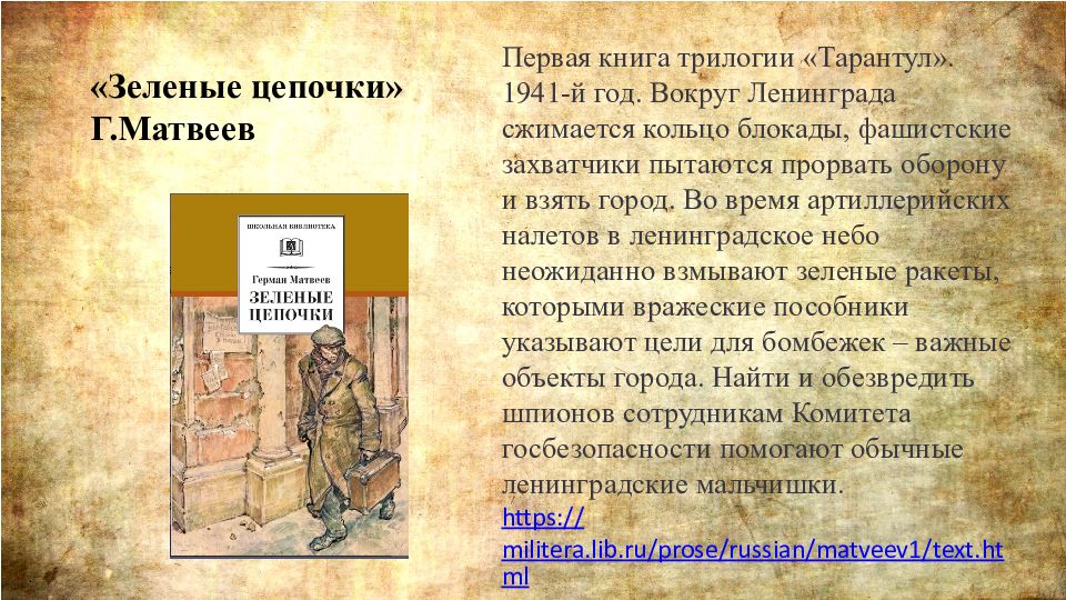 «Зеленые цепочки» Г.Матвеев Первая книга трилогии «Тарантул». 1941-й год. Вокруг Ленинграда сжимается кольцо блокады, фашистские захватчики пытаются прорвать оборону и взять город. Во время артиллерийских налетов в ленинградское небо неожиданно взмывают зеленые ракеты, которыми вражеские пособники указывают цели для бомбежек – важные объекты города. Найти и обезвредить шпионов сотрудникам Комитета госбезопасности помогают обычные ленинградские мальчишки. https:// militera.lib.ru/prose/russian/matveev1/text.html