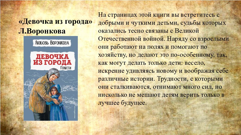 «Девочка из города» Л.Воронкова На страницах этой книги вы встретитесь с добрыми и чуткими детьми, судьбы которых оказались тесно связаны с Великой Отечественной войной. Наряду со взрослыми они работают на полях и помогают по хозяйству, но делают это по-особенному, так, как могут делать только дети: весело, искренне удивляясь новому и воображая себе различные истории. Трудности, с которыми они сталкиваются, отнимают много сил, но нисколько не мешают детям верить только в лучшее будущее.