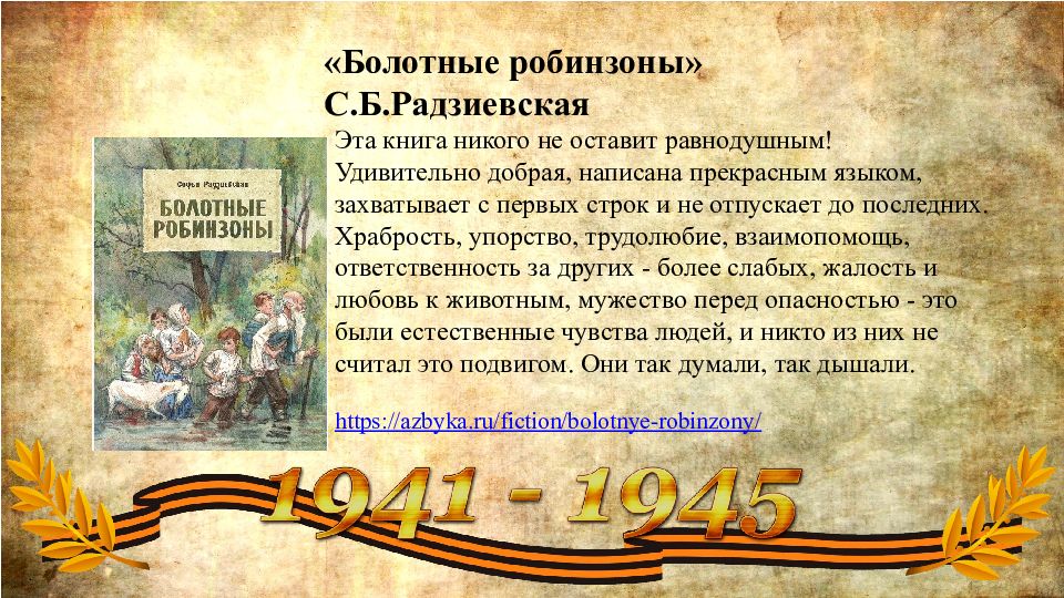 «Болотные робинзоны » С.Б.Радзиевская Эта книга никого не оставит равнодушным! Удивительно добрая, написана прекрасным языком, захватывает с первых строк и не отпускает до последних. Храбрость, упорство, трудолюбие, взаимопомощь, ответственность за других - более слабых, жалость и любовь к животным, мужество перед опасностью - это были естественные чувства людей, и никто из них не считал это подвигом. Они так думали, так дышали. https://azbyka.ru/fiction/bolotnye-robinzony /