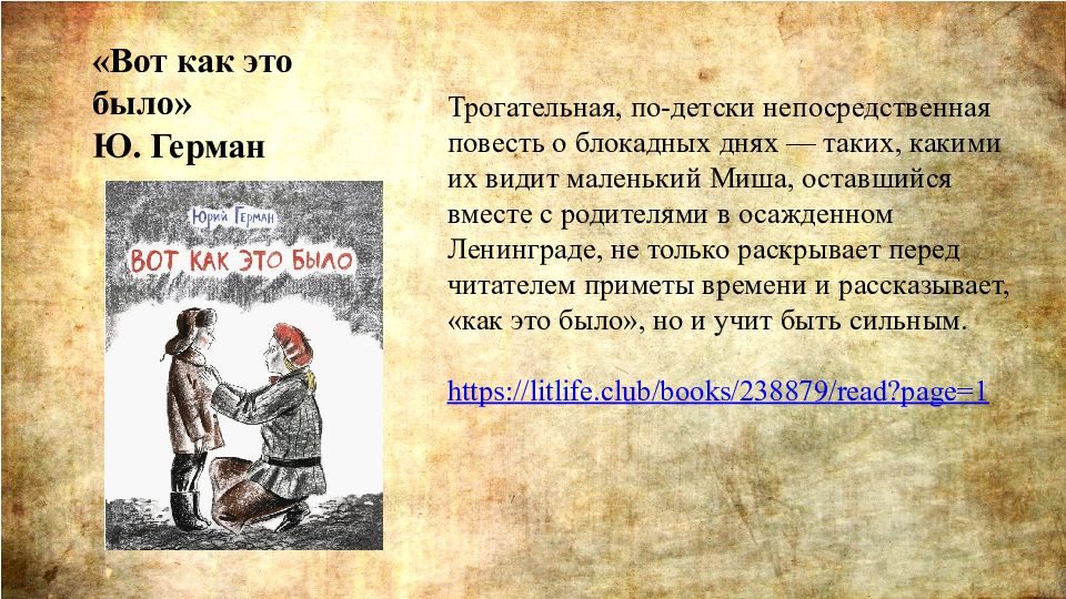 «Вот как это было» Ю. Герман Трогательная, по-детски непосредственная повесть о блокадных днях — таких, какими их видит маленький Миша, оставшийся вместе с родителями в осажденном Ленинграде, не только раскрывает перед читателем приметы времени и рассказывает, «как это было», но и учит быть сильным. https :// litlife.club/books/238879/read?page=1
