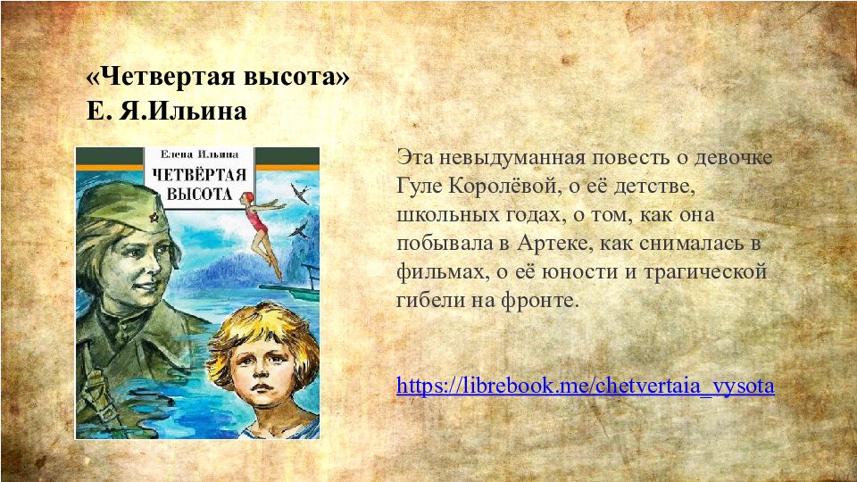 «Четвертая высота» Е. Я.Ильина Эта невыдуманная повесть о девочке Гуле Королёвой, о её детстве, школьных годах, о том, как она побывала в Артеке, как снималась в фильмах, о её юности и трагической гибели на фронте. https:// librebook.me/chetvertaia_vysota