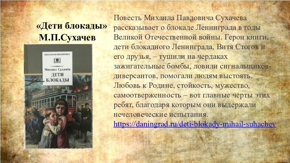 «Дети блокады» М.П.Сухачев Повесть Михаила Павловича Сухачева рассказывает о блокаде Ленинграда в годы Великой Отечественной войны. Герои книги, – дети блокадного Ленинграда, Витя Стогов и его друзья, – тушили на чердаках зажигательные бомбы, ловили сигнальщиков-диверсантов, помогали людям выстоять. Любовь к Родине, стойкость, мужество, самоотверженность – вот главные черты этих ребят, благодаря которым они выдержали нечеловеческие испытания. https:// daningrad.ru/deti-blokady-mihail-suhachev