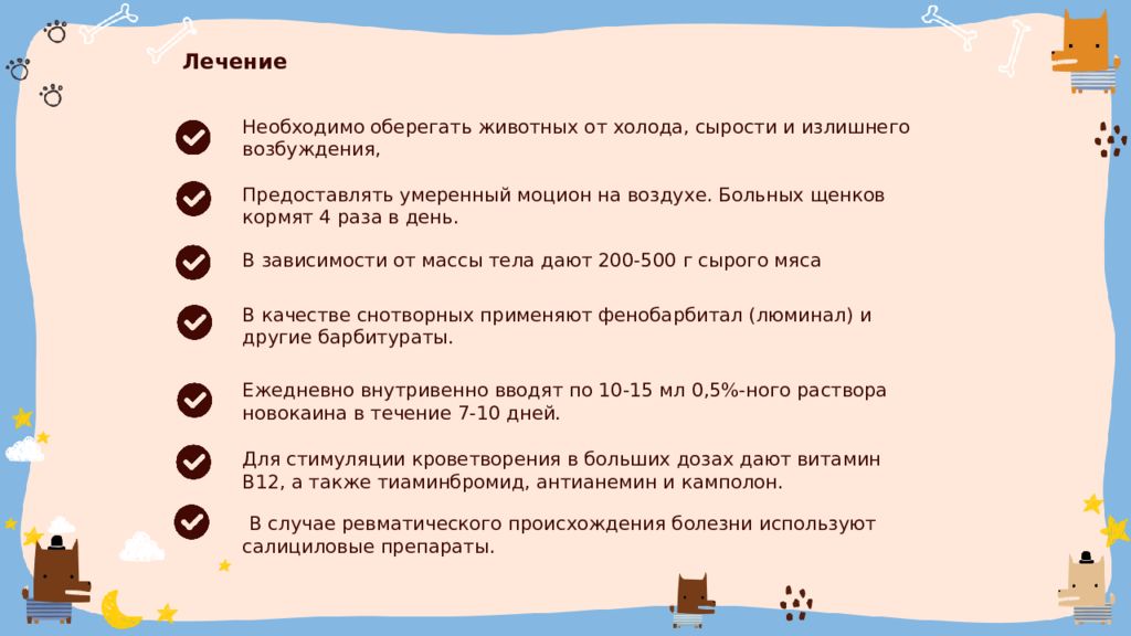 Необходимо оберегать животных от холода, сырости и излишнего возбуждения, Предоставлять умеренный моцион на воздухе. Больных щенков кормят 4 раза в день. Для стимуляции кроветворения в больших дозах дают витамин В12, а также тиаминбромид, антианемин и камполон. Лечение В случае ревматического происхождения болезни используют салициловые препараты. В зависимости от массы тела дают 200-500 г сырого мяса В качестве снотворных применяют фенобарбитал (люминал) и другие барбитураты. Ежедневно внутривенно вводят по 10-15 мл 0,5%- ного раствора новокаина в течение 7-10 дней.