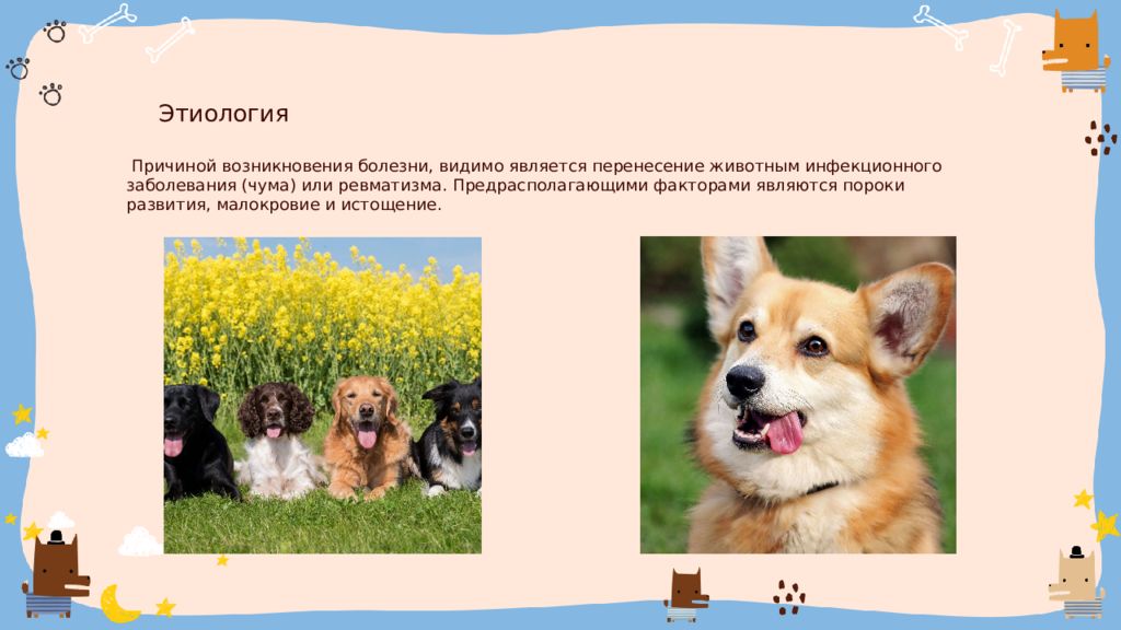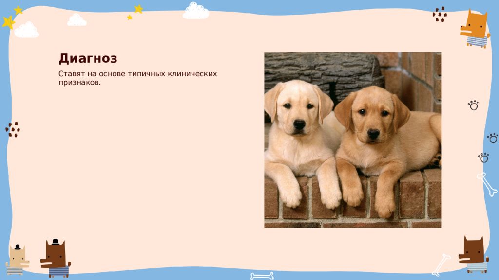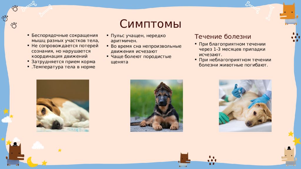 Симптомы Беспорядочные сокращения мышц разных участков тела, Не сопровождается потерей сознания, но нарушается координация движений Затрудняется прием корма .Температура тела в норме Пульс учащен, нередко аритмичен. Во время сна непроизвольные движения исчезают Чаще болеют породистые щенята При благоприятном течении через 1-3 месяцев припадки исчезают. При неблагоприятном течении болезни животные погибают. Течение болезни