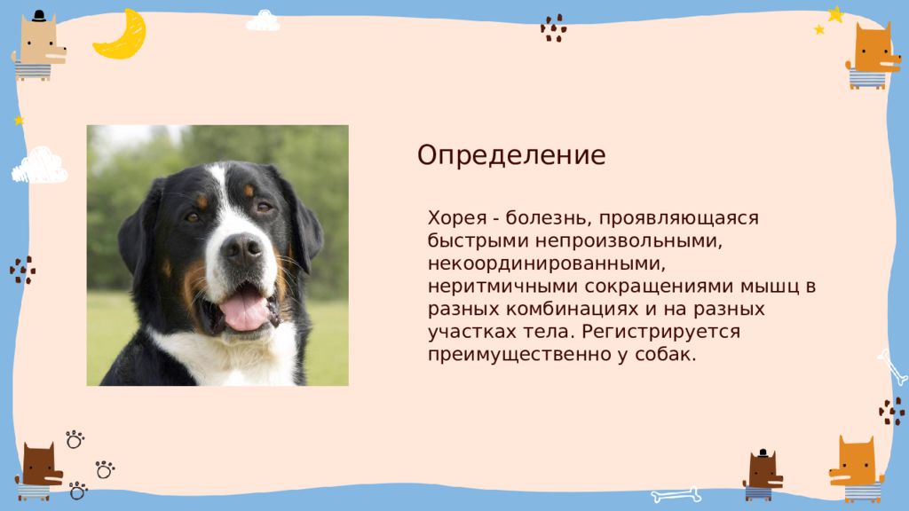 Определение Хорея - болезнь, проявляющаяся быстрыми непроизвольными, некоординированными, неритмичными сокращениями мышц в разных комбинациях и на разных участках тела. Регистрируется преимущественно у собак.