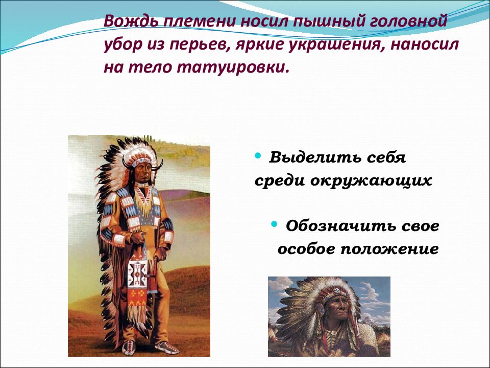 Слайд 8: Вождь племени носил пышный головной убор из перьев, яркие украшения, наносил на тело татуировки