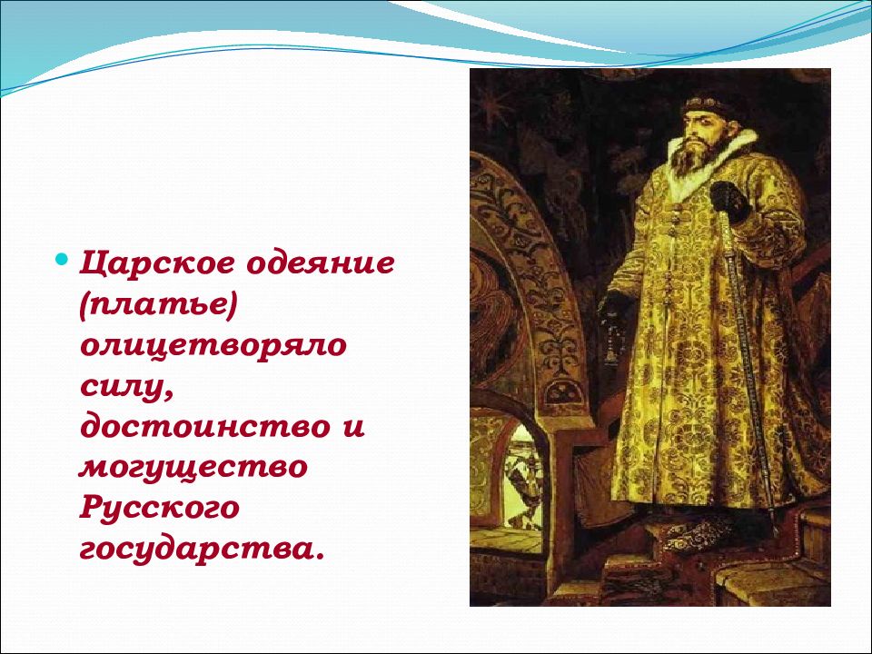 Царское одеяние (платье) олицетворяло силу, достоинство и могущество Русского государства.