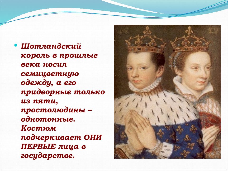 Шотландский король в прошлые века носил семицветную одежду, а его придворные только из пяти, простолюдины – однотонные. Костюм подчеркивает ОНИ ПЕРВЫЕ лица в государстве.