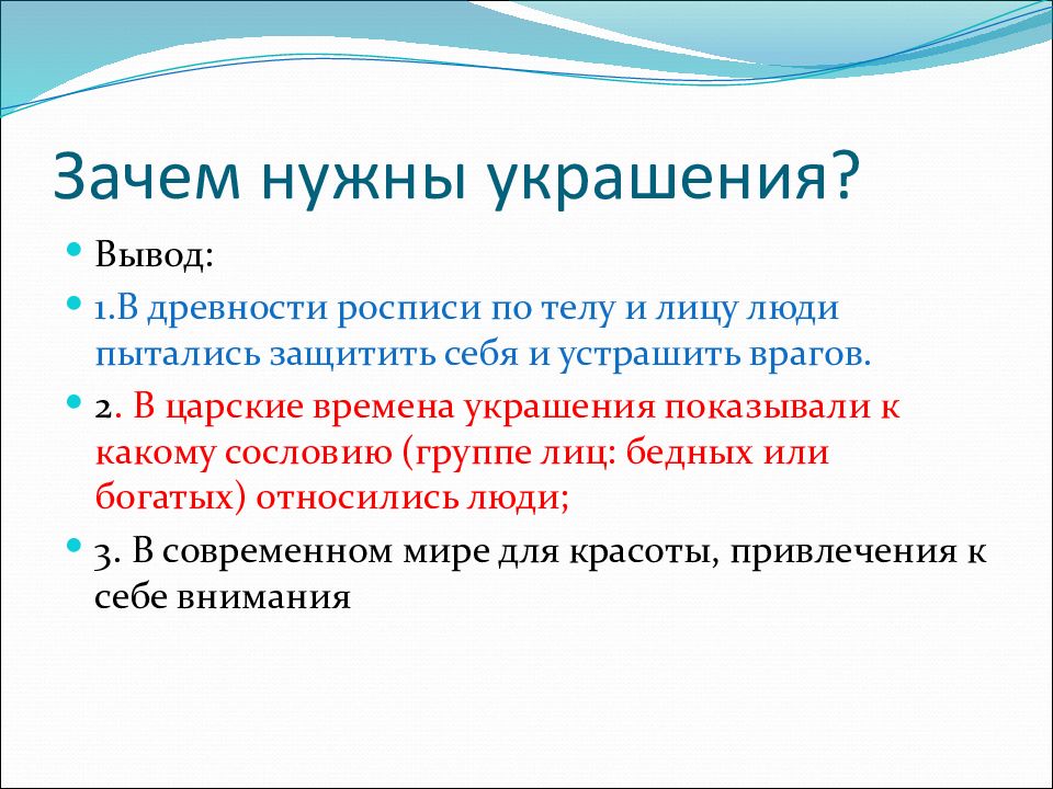 Вывод: 1.В древности росписи по телу и лицу люди пытались защитить себя и устрашить врагов. 2. В царские времена украшения показывали к какому сословию (группе лиц: бедных или богатых) относились люди; 3. В современном мире для красоты, привлечения к себе внимания