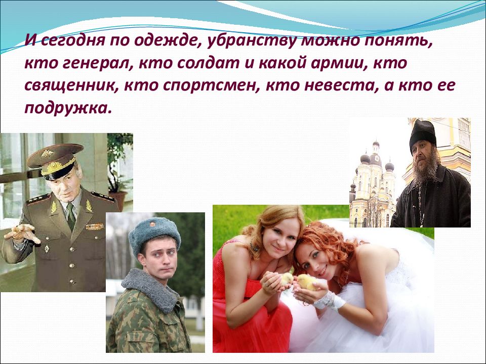 Слайд 14: И сегодня по одежде, убранству можно понять, кто генерал, кто солдат и какой армии, кто священник, кто спортсмен, кто невеста, а кто ее подружка