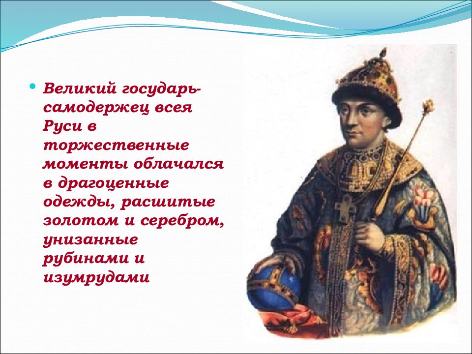 Великий государь- самодержец всея Руси в торжественные моменты облачался в драгоценные одежды, расшитые золотом и серебром, унизанные рубинами и изумрудами