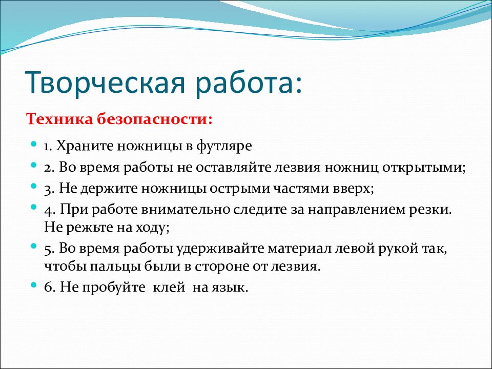 Техника безопасности: 1. Храните ножницы в футляре 2. Во время работы не оставляйте лезвия ножниц открытыми; 3. Не держите ножницы острыми частями вверх; 4. При работе внимательно следите за направлением резки. Не режьте на ходу; 5. Во время работы удерживайте материал левой рукой так, чтобы пальцы были в стороне от лезвия. 6. Не пробуйте клей на язык.