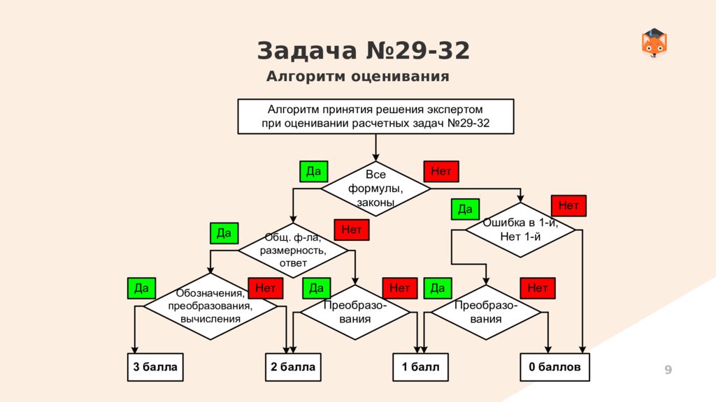 8 Критерии оценивания. Дополнительные сведения Задача №29 - 32 № Изменения в условии задач 29-32 Изменения в схеме проверки 1 Не требуется получение численного ответа Снимаются требования на верные расчёты 2 Содержится требование сделать рисунок с указанием сил Добавляется пункт «приведен правильный рисунок с указанием сил, действующих на тело» 3 Содержится требование изобразить схему электрической цепи или оптическую схему Добавляется пункт «приведен правильный рисунок, поясняющий решение»