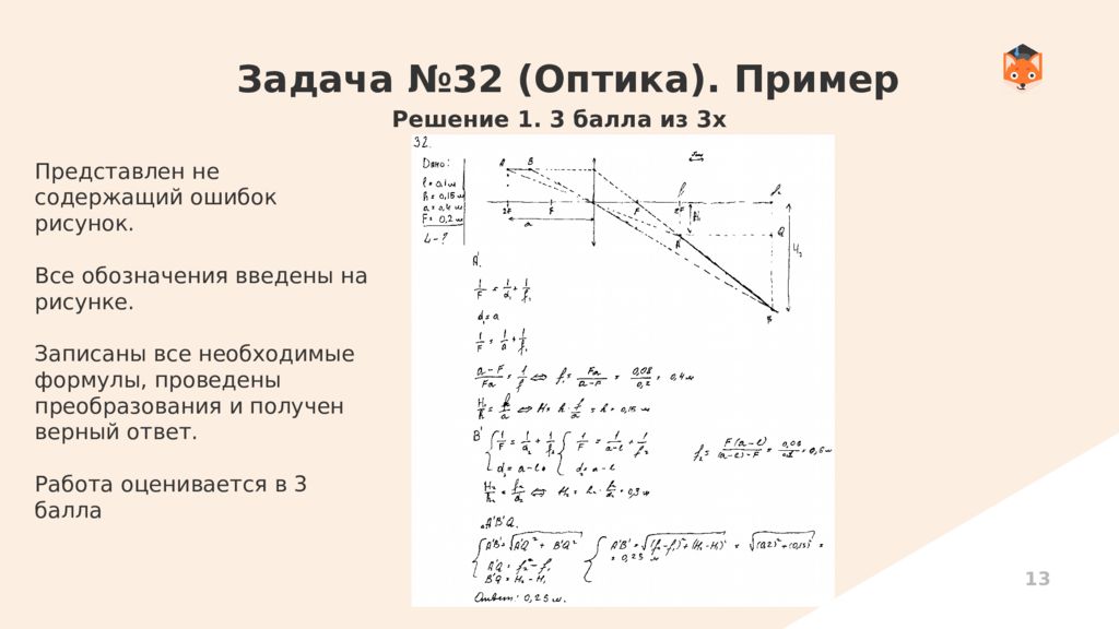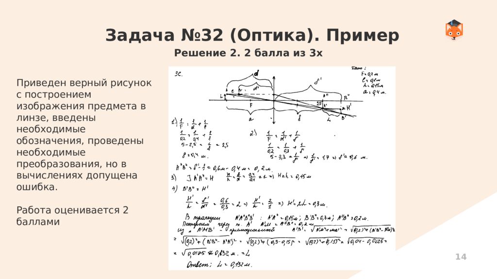 13 Решение 1. 3 балла из 3 х Задача №32 (Оптика). Пример Представлен не содержащий ошибок рисунок. Все обозначения введены на рисунке. Записаны все необходимые формулы, проведены преобразования и получен верный ответ. Работа оценивается в 3 балла