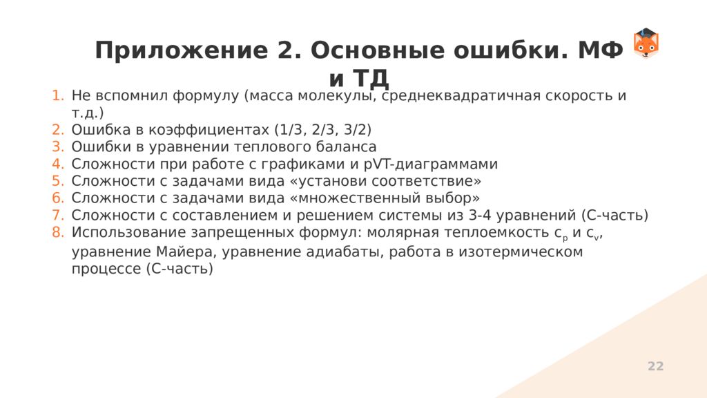 Не вспомнил формулу (масса молекулы, среднеквадратичная скорость и т.д.) О шибка в коэффициентах (1/3, 2/3, 3/2) Ошибки в уравнении теплового баланса Сложности при работе с графиками и pVT - диаграммами Сложности с задачами вида «установи соответствие» Сложности с задачами вида «множественный выбор» Сложности с составлением и решением системы из 3-4 уравнений (С-часть) Использование запрещенных формул: молярная теплоемкость с p и c v, уравнение Майера, уравнение адиабаты, работа в изотермическом процессе (С-часть) 22 Приложение 2. Основные ошибки. МФ и ТД