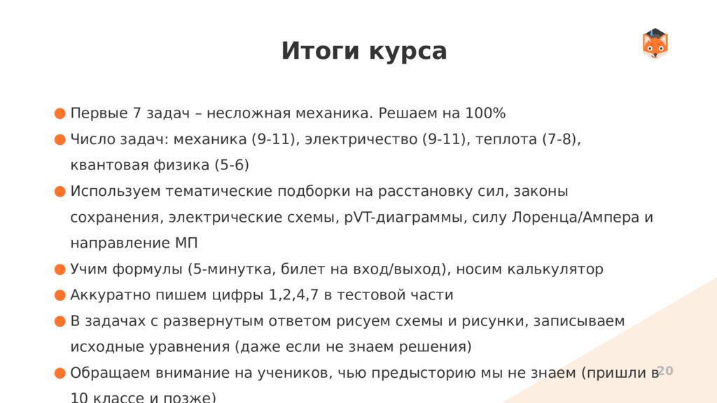 20 Итоги курса Первые 7 задач – несложная механика. Решаем на 100% Число задач: механика (9-11), электричество (9-11), теплота (7-8), квантовая физика (5-6) Используем тематические подборки на расстановку сил, законы сохранения, электрические схемы, pVT - диаграммы, силу Лоренца/Ампера и направление МП Учим формулы (5-минутка, билет на вход/выход), носим калькулятор Аккуратно пишем цифры 1,2,4,7 в тестовой части В задачах с развернутым ответом рисуем схемы и рисунки, записываем исходные уравнения (даже если не знаем решения) Обращаем внимание на учеников, чью предысторию мы не знаем (пришли в 10 классе и позже)