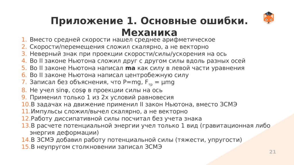 Слайд 21: Приложение 1. Основные ошибки. Механика