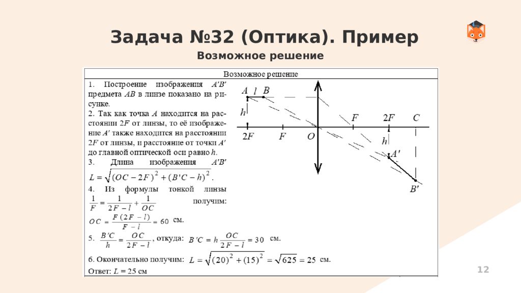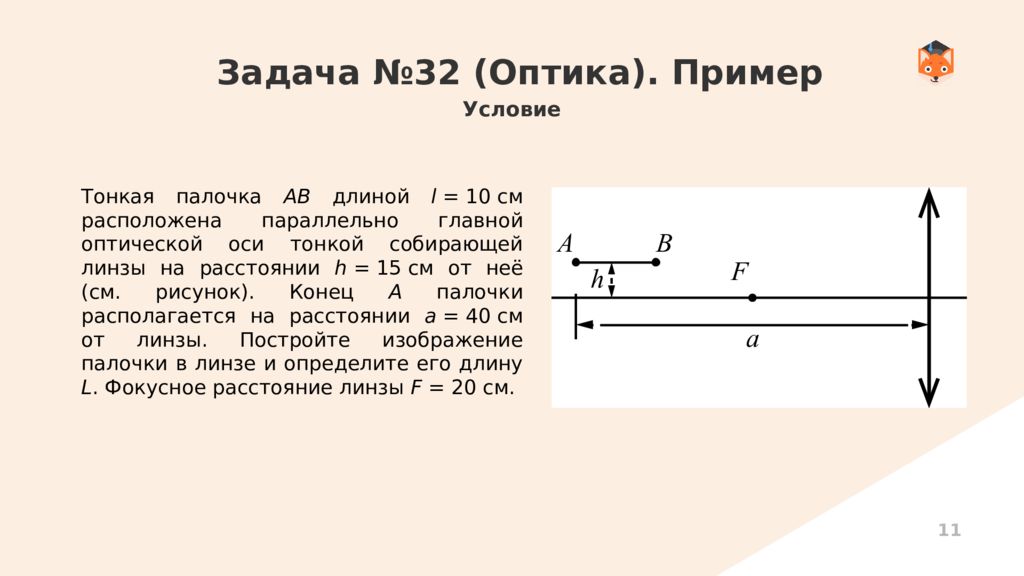 11 Условие Задача №32 (Оптика). Пример Тонкая палочка АВ длиной l = 10 см расположена параллельно главной оптической оси тонкой собирающей линзы на расстоянии h = 15 см от неё (см. рисунок). Конец А палочки располагается на расстоянии а = 40 см от линзы. Постройте изображение палочки в линзе и определите его длину L. Фокусное расстояние линзы F = 20 c м.