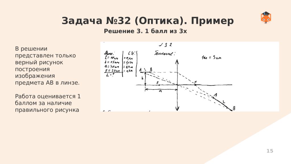 14 Решение 2. 2 балла из 3 х Задача №32 (Оптика). Пример Приведен верный рисунок с построением изображения предмета в линзе, введены необходимые обозначения, проведены необходимые преобразования, но в вычислениях допущена ошибка. Работа оценивается 2 баллами