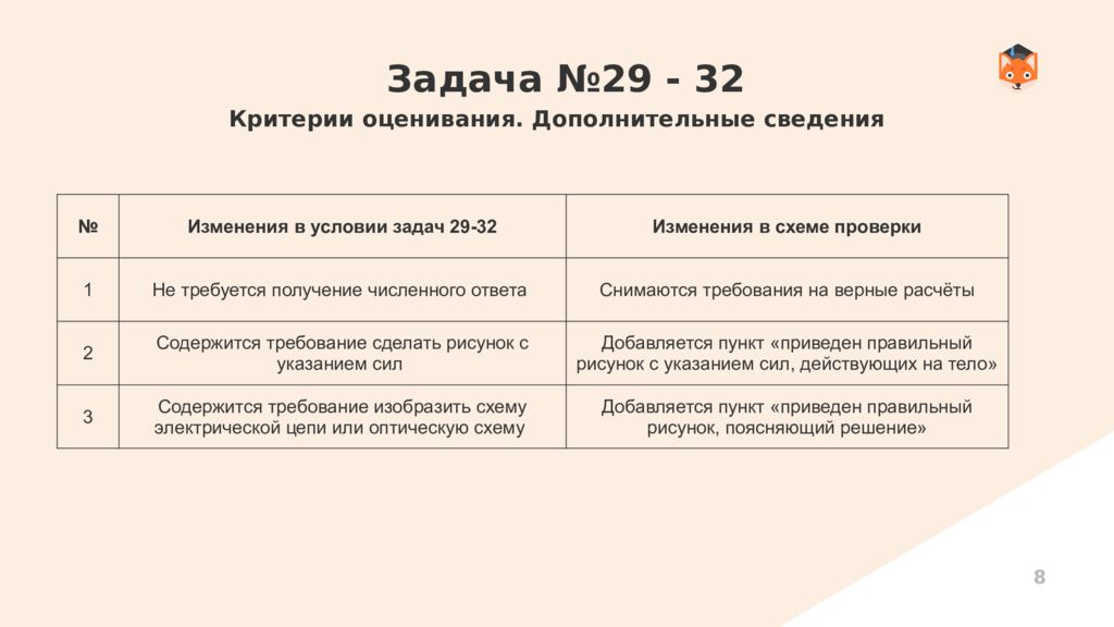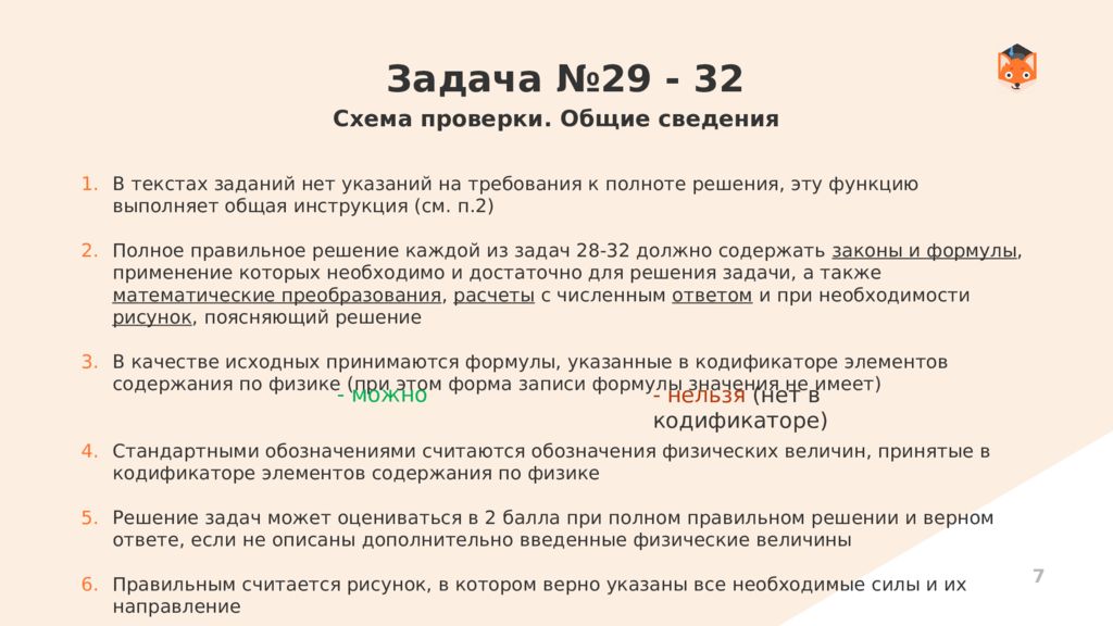 7 Схема проверки. Общие сведения Задача №29 - 32 В текстах заданий нет указаний на требования к полноте решения, эту функцию выполняет общая инструкция (см. п.2) Полное правильное решение каждой из задач 28-32 должно содержать законы и формулы, применение которых необходимо и достаточно для решения задачи, а также математические преобразования, расчеты с численным ответом и при необходимости рисунок, поясняющий решение В качестве исходных принимаются формулы, указанные в кодификаторе элементов содержания по физике (при этом форма записи формулы значения не имеет) Стандартными обозначениями считаются обозначения физических величин, принятые в кодификаторе элементов содержания по физике Решение задач может оцениваться в 2 балла при полном правильном решении и верном ответе, если не описаны дополнительно введенные физические величины Правильным считается рисунок, в котором верно указаны все необходимые силы и их направление - можно - нельзя (нет в кодификаторе)